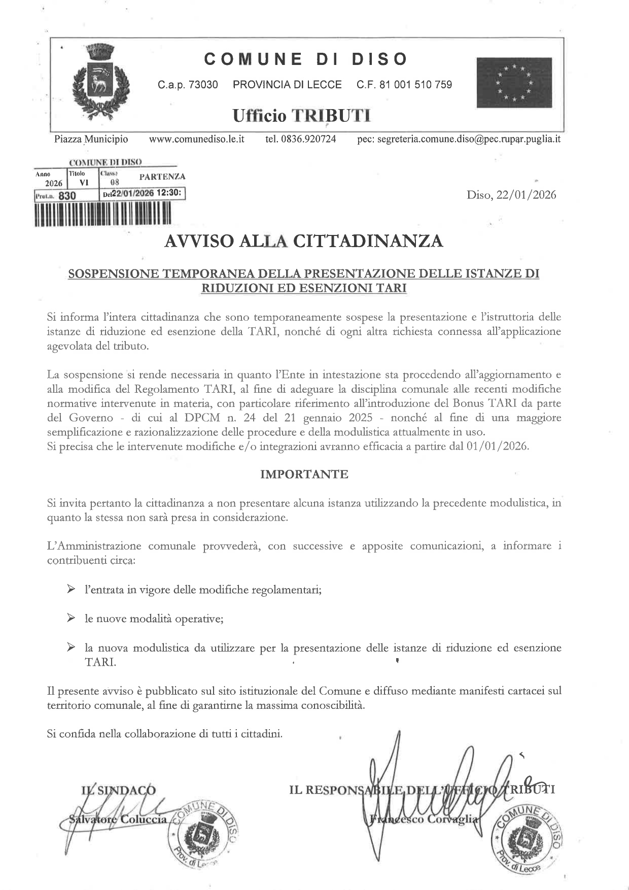 Versamento tributo TARI - comunicazione di servizio sospensione presentazione istanze agevolazioni fiscali.