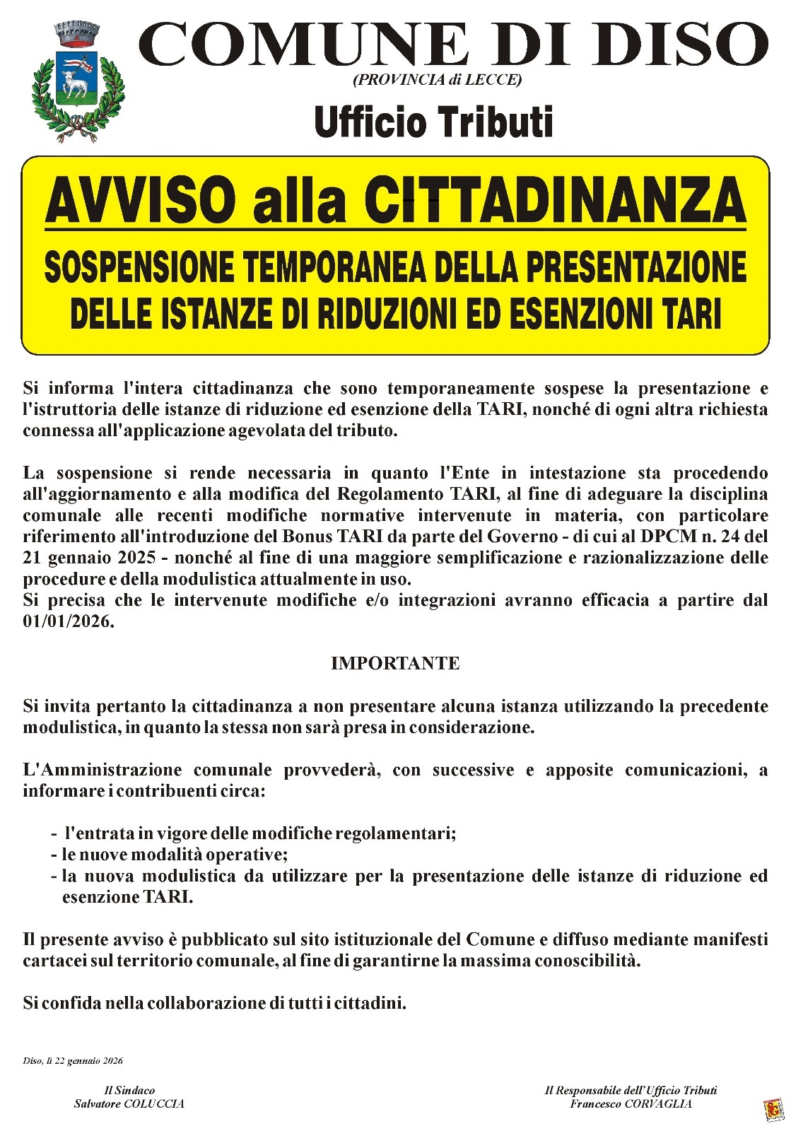Versamento tributo TARI - comunicazione di servizio sospensione presentazione istanze agevolazioni fiscali.