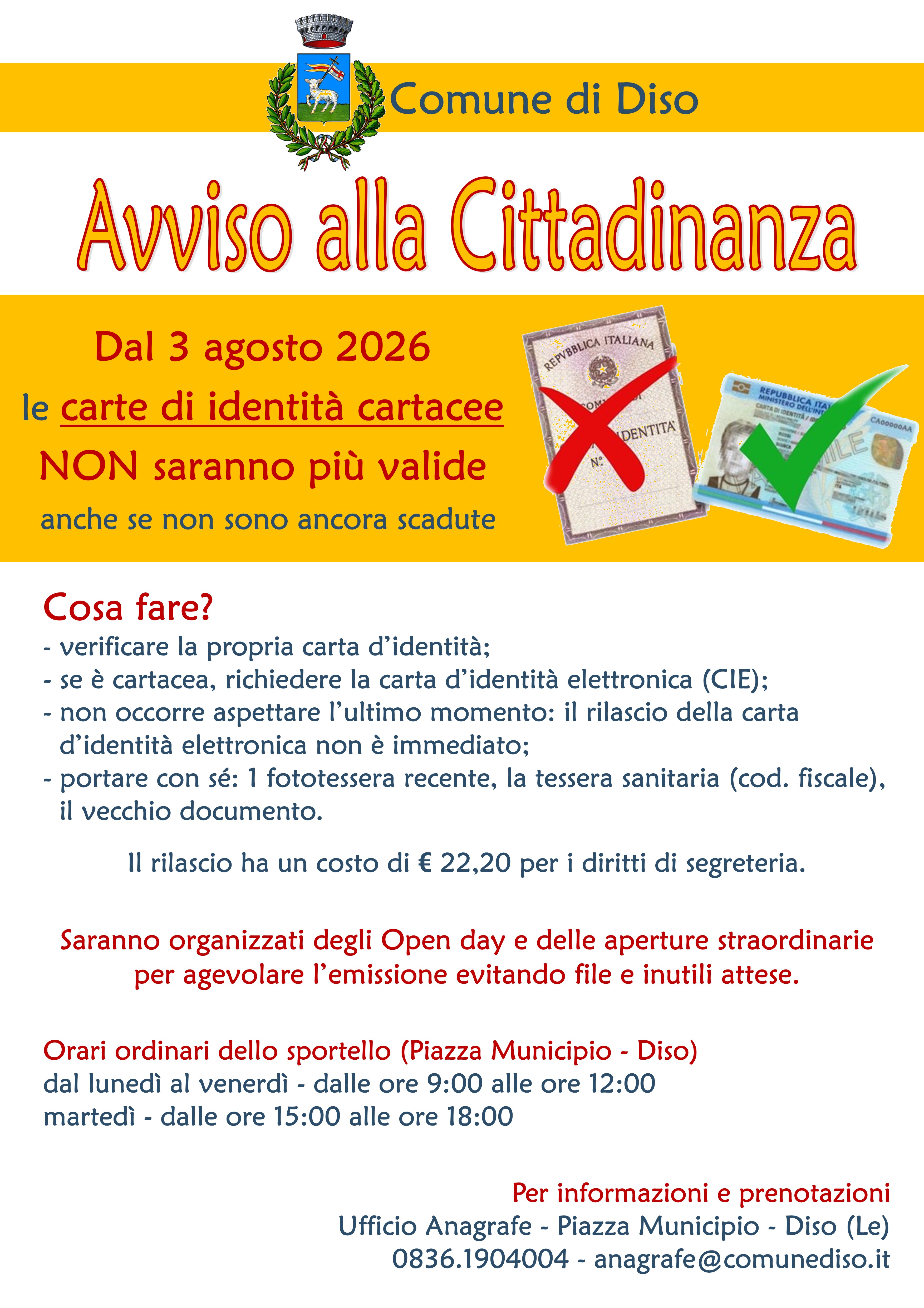 Dal 03.08.26 le carte di identità cartacee NON saranno più valide (anche se ancora in corso di validità) , pertanto il Comune ha disposto delle giornate di apertura straordinaria per il rilascio delle nuove "CARTE DI IDENTITA' ELETTRONICHE"